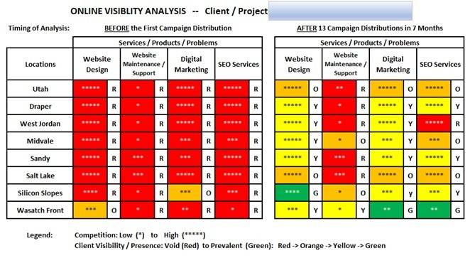 As you can see from the “BEFORE” Analysis, this is a very competitive market niche … Website Development / Digital Marketing ... in a very competitive area … the Salt Lake City metropolitan area of northern Utah, sometimes referred to as the “Wasatch Front” or the home of “Silicon Slopes”. The existing marketplace was so competitive, with well-established marketing agencies in this space, that traditional SEO methods simply did not “move the needle” in terms of search visibility for our firm.